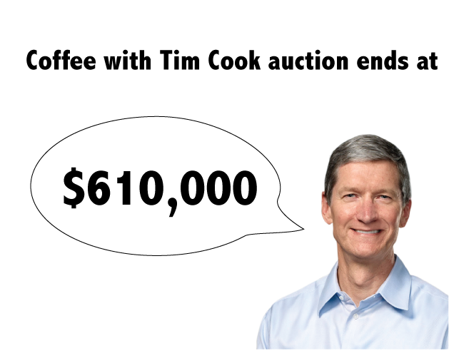 The “Coffee with Apple CEO Tim Cook” auction ended at $610,000. Yes, that's right - someone paid $610,000 to have coffee with Tim Cook for 30min and an hour at Apple’s headquarters in Cupertino, California. The proceeds from this auction will go to an international nonprofit, The Robert F. Kennedy Center for Justice and Human Rights. I understand that this was all done for charity, but $610,000 to chat with someone for 30 minutes? I want to know who this rich person is!